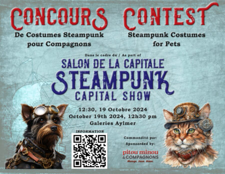 Concours de costume pour compagnons / Pet costume contestPrésentée par / Presented by:Association Steampunk province de QuébecKiosque / BoothScène principale / Main stageCompétition / CompetitionSamedi 12:30 / Saturday 12h30 pmInscription…